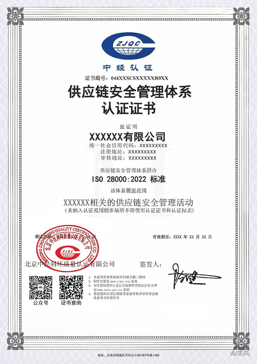 ISO28000认证是非强制性管理体系认证,由第三方认证机构依据ISO28000供应链安全管理体系对符合标准的企业颁发认证证书。